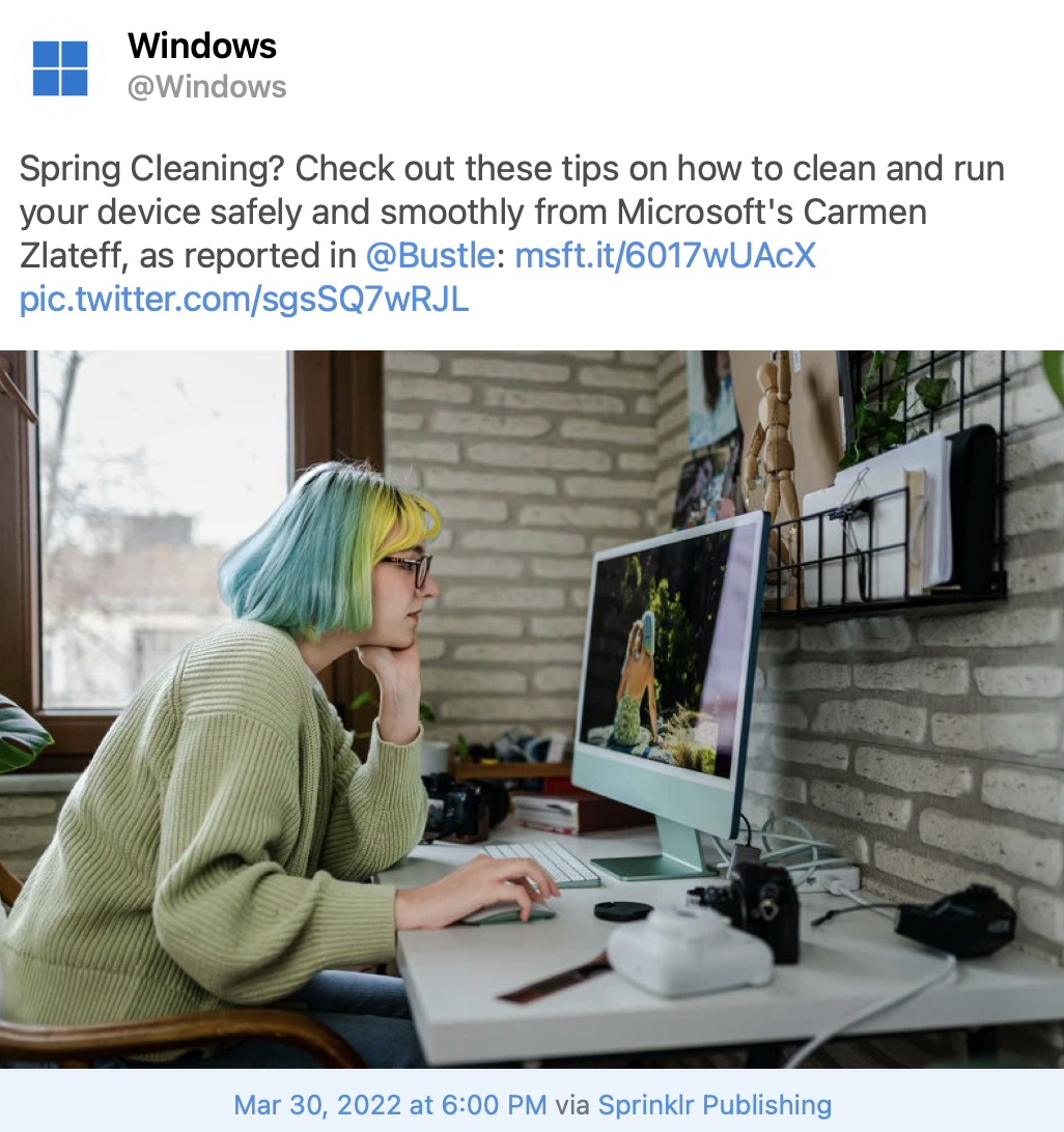 The tweet was published with a service called Sprinklr, and included a link to an article published on Bustle. The article was the original source of the M1 iMac image1, and the article covers Macs as well as Windows PCs. The Sprinklr service automatically generated rich media it sourced from the article to include in the tweet. The outcome was funny, and also purely coincidental. The person responsible for managing this Twitter account for the Windows team did not choose this image at all. You could say that they should have noticed the technical issue with the image that was populated, but is that something we can assume they should know? I don’t believe that it is.